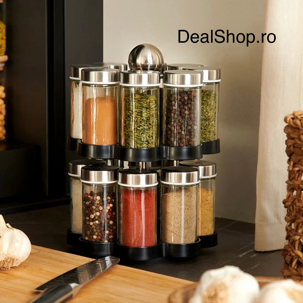 Suport rotativ condimente 12 recipiente sticlă 100 ml, set organizator bucătărie cu suport solid și finisaje metalice Brio Metallica