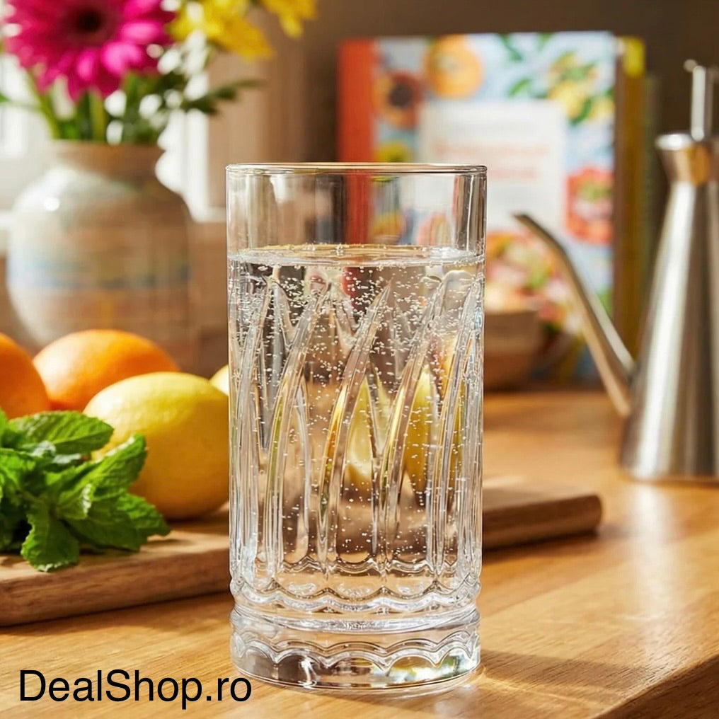 Set 6 pahare înalte sticlă 370 ml Zoe377, pahare apă / suc, design elegant cu model geometric, sticlă rezistentă