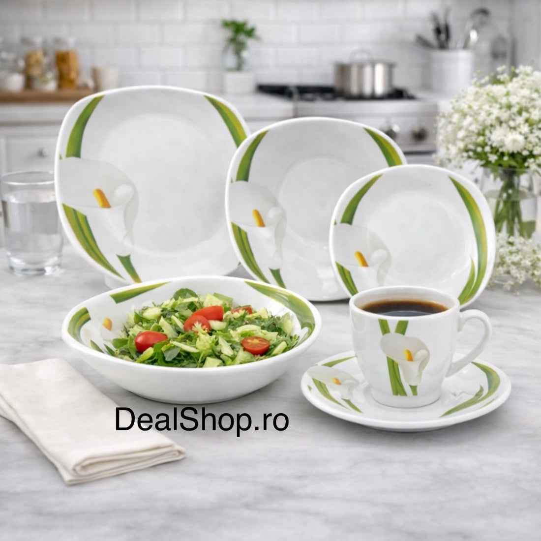 Serviciu de masă din porțelan 31 piese pentru 6 persoane, set farfurii și cești cafea 180 ml, model Cală