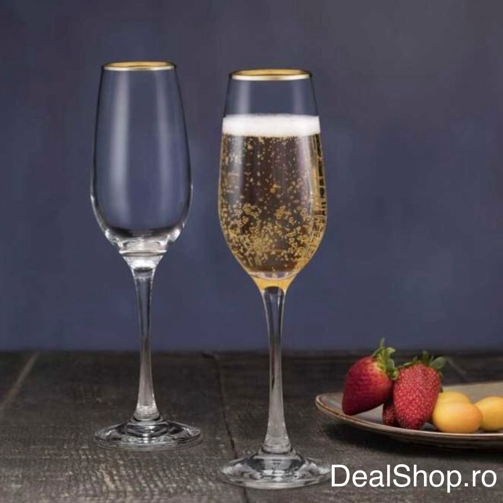 Set 6 pahare șampanie 200 ml Amber Gold, sticlă cu margine aurie, pahare flute elegante pentru prosecco și cocktailuri