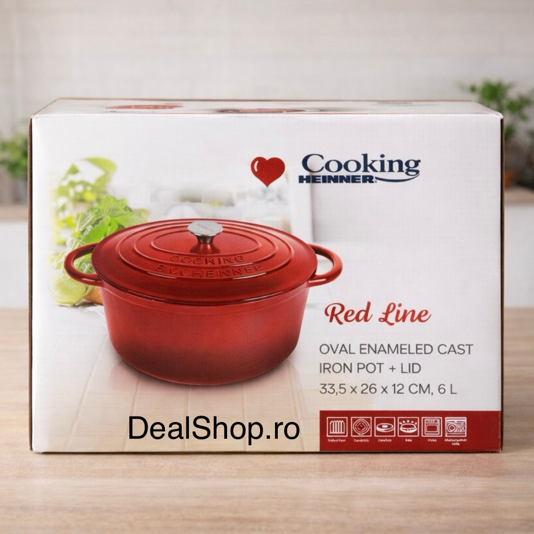 Oală ovală fontă emailată 6L cu capac Cooking by Heinner Red Line – 33.5×26×12 cm, vas profesional gătit la cuptor & plită