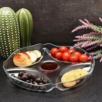 Platou divizat din sticlă 30 cm, 4 compartimente + loc pentru sos, platou aperitive elegant 10473