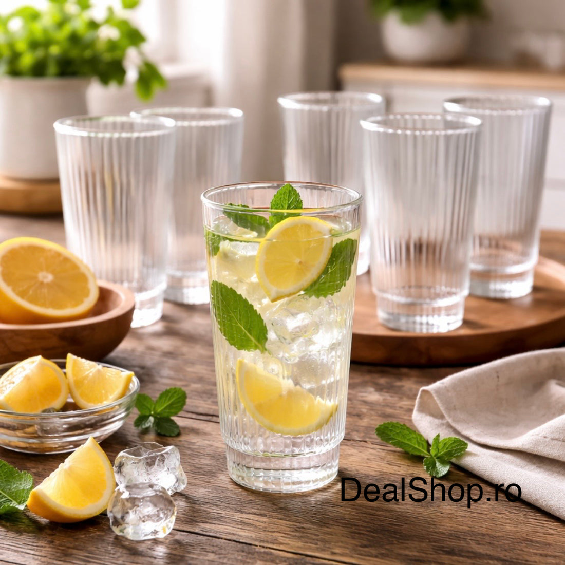 Set 6 pahare sticlă Lorita 240 ml, model striat, sticlă groasă transparentă, pahare highball pentru apă, suc, cocktail