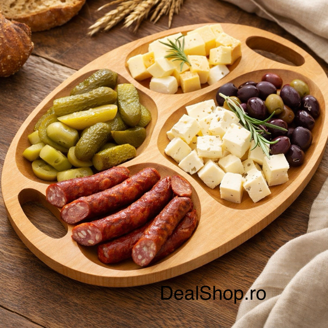 Alege o servire elegantă și practică cu acest platou din lemn natural compartimentat, ideal pentru...