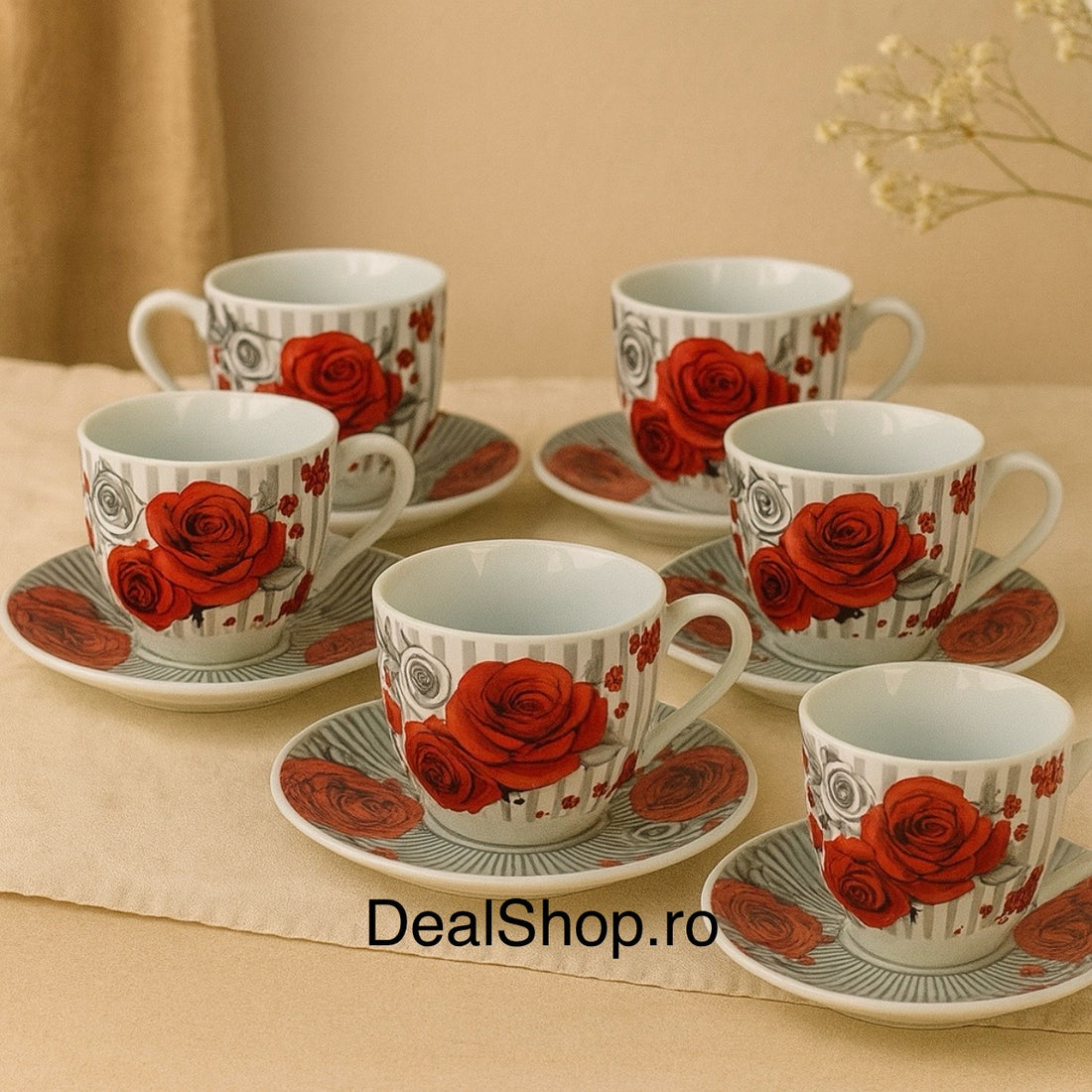 Set 6 cești cu 6 farfurii din porțelan, 120 ml – model floral cu trandafiri