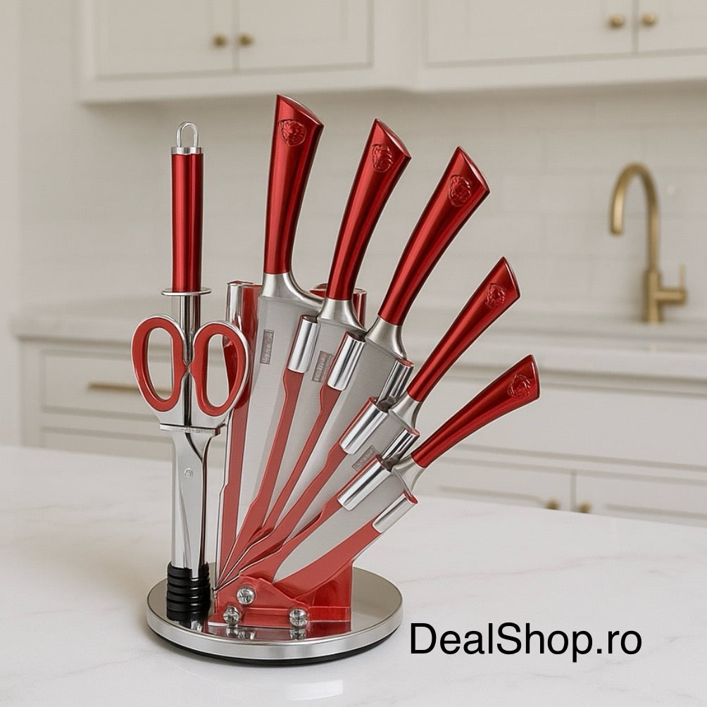 Set cutite cu suport rotativ 8 Piese Royalty Line RL-KSS804 Roșii Precizie si Eleganta in Bucatarie