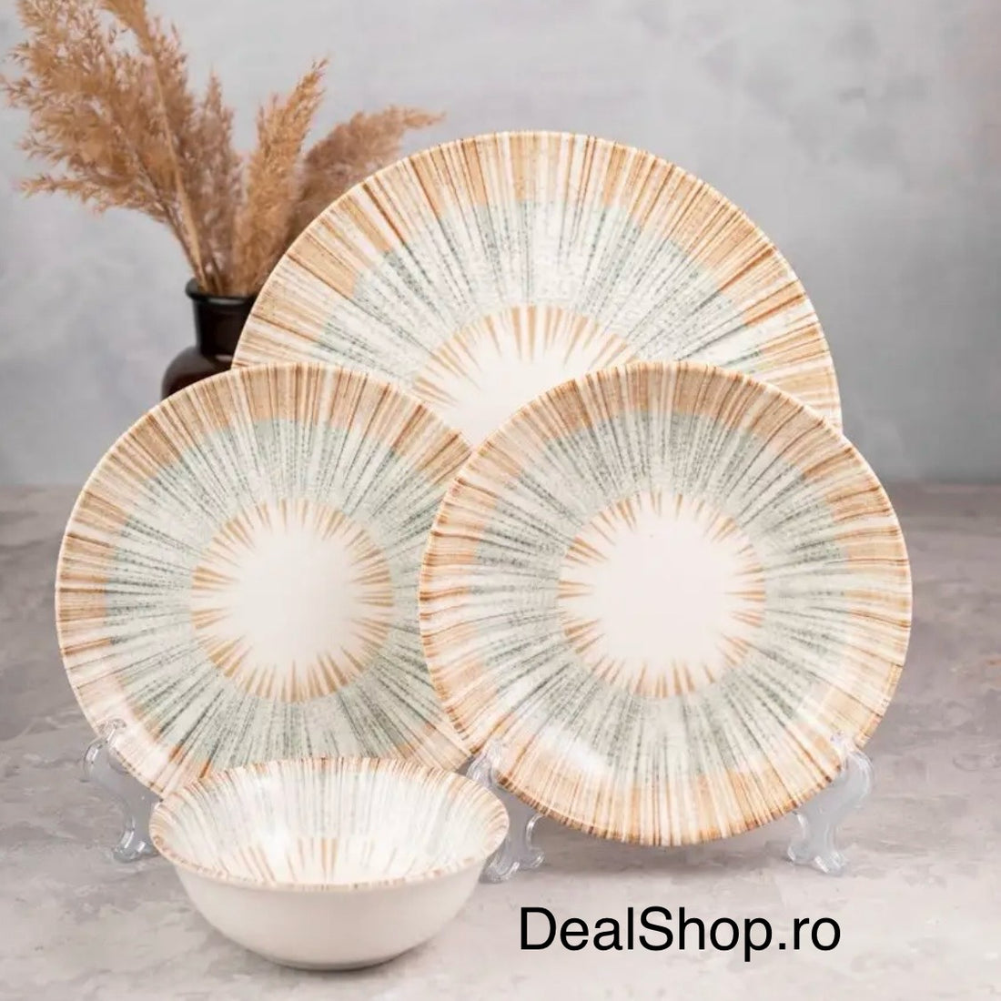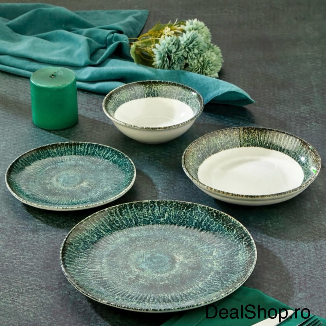 Serviciu de masa portelan 24 piese, pentru 6 persoane model texturat verde-maro elegant și modern 0186