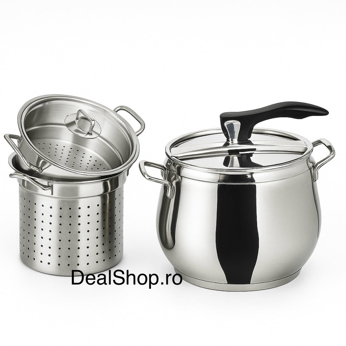 Oală 8 litri Inox pentru aburi, 24 cm, capac inox, inserție detasabilă, compatibilă inducție
