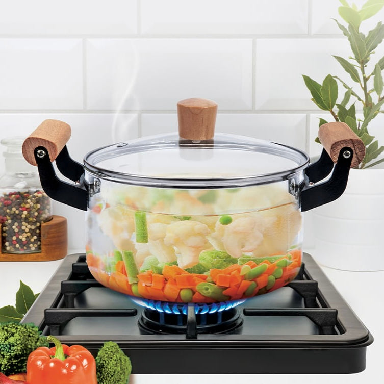 Cratiță cu Capac din Sticlă Borsilicata,manere din lemn Termorezistentă 2,5 Litri