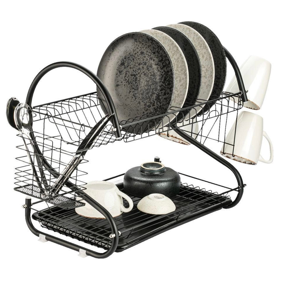 Uscator de vase cu suport pahare si tacamuri, din otel, pe 2 nivele, cu tava de scurgere, 40,5x24x38cm, negru