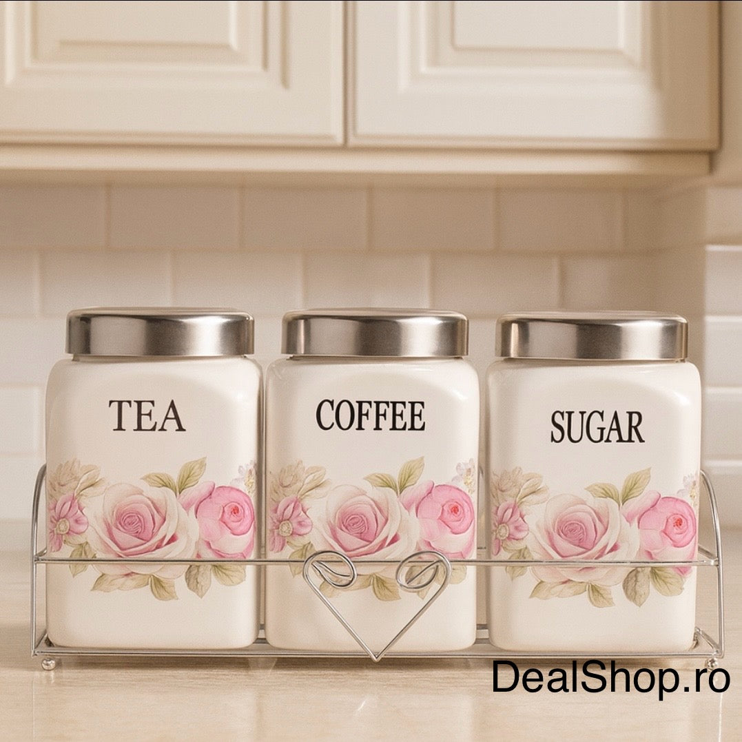 SET 3 RECIPIENTE CONDIMENTE CERAMICA CU CAPAC INOX SI SUPORT METALIC