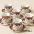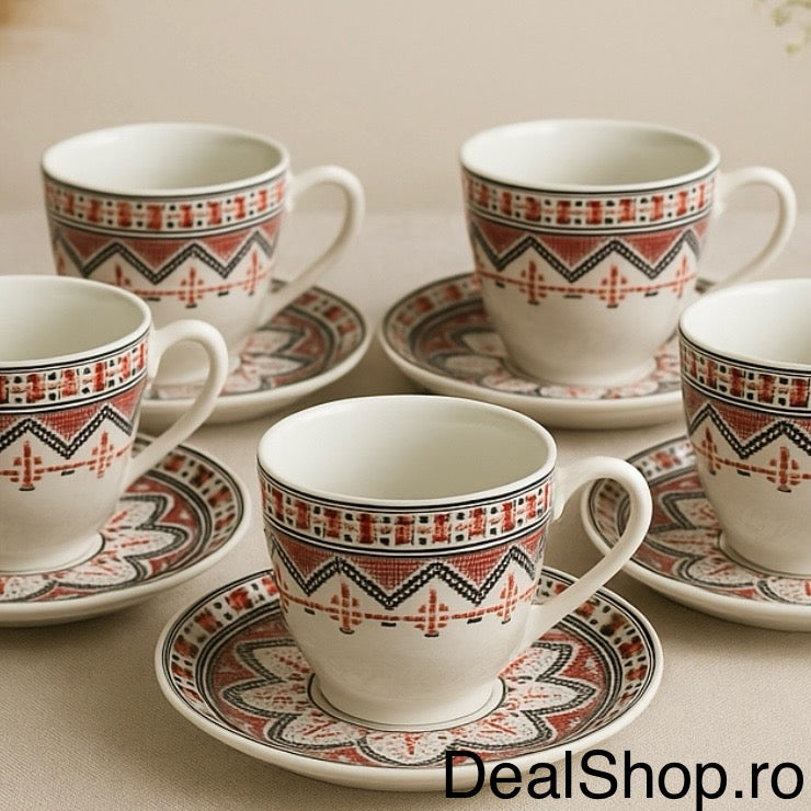 Acest set conține 6 cești de 120 ml și 6 farfurioare asortate, decorate cu motive tradiționale în nuanțe vii de roșu și negru care aduc un plus de eleganță și originalitate fiecărei mese