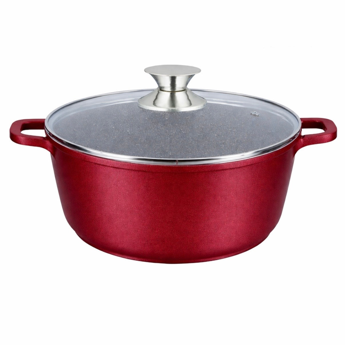 Cratiță aluminiu turnat 36 cm cu capac sticlă, 14L, interior marmură , Inducție, Roșie – SWAN