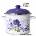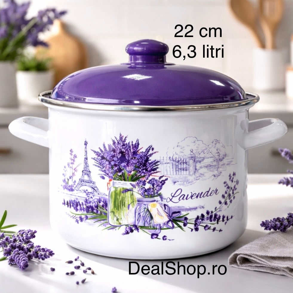 Oală Emailată 22 cm, 6,3 Litri cu Capac – Model Lavandă Mov – Oală Înaltă pentru Supă Ciorbă