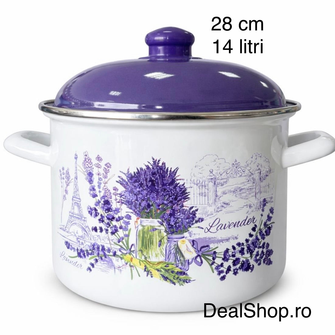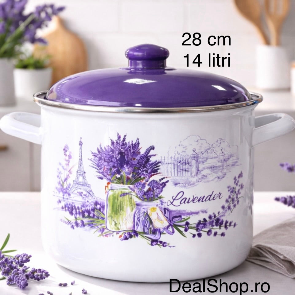 Oală Emailată 28 cm, 14 Litri cu Capac – Model Lavandă Mov – Oală Mare pentru Sarmale, Supă și Gătit în Cantități Mari