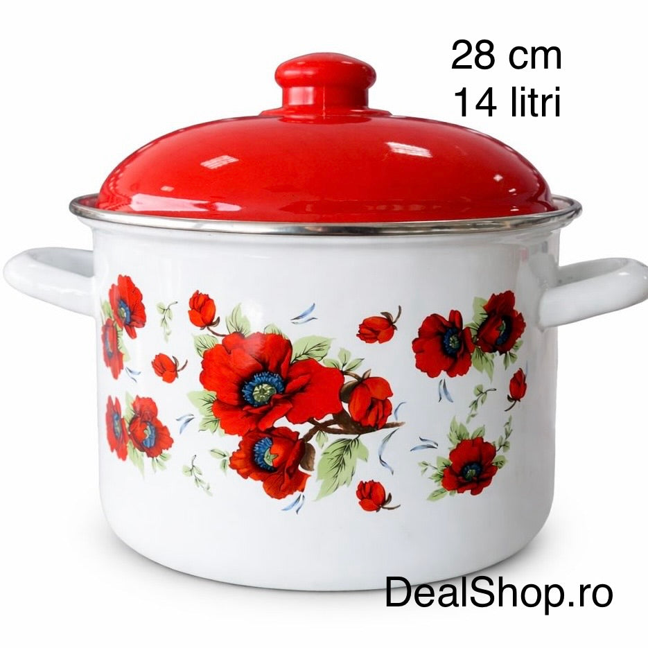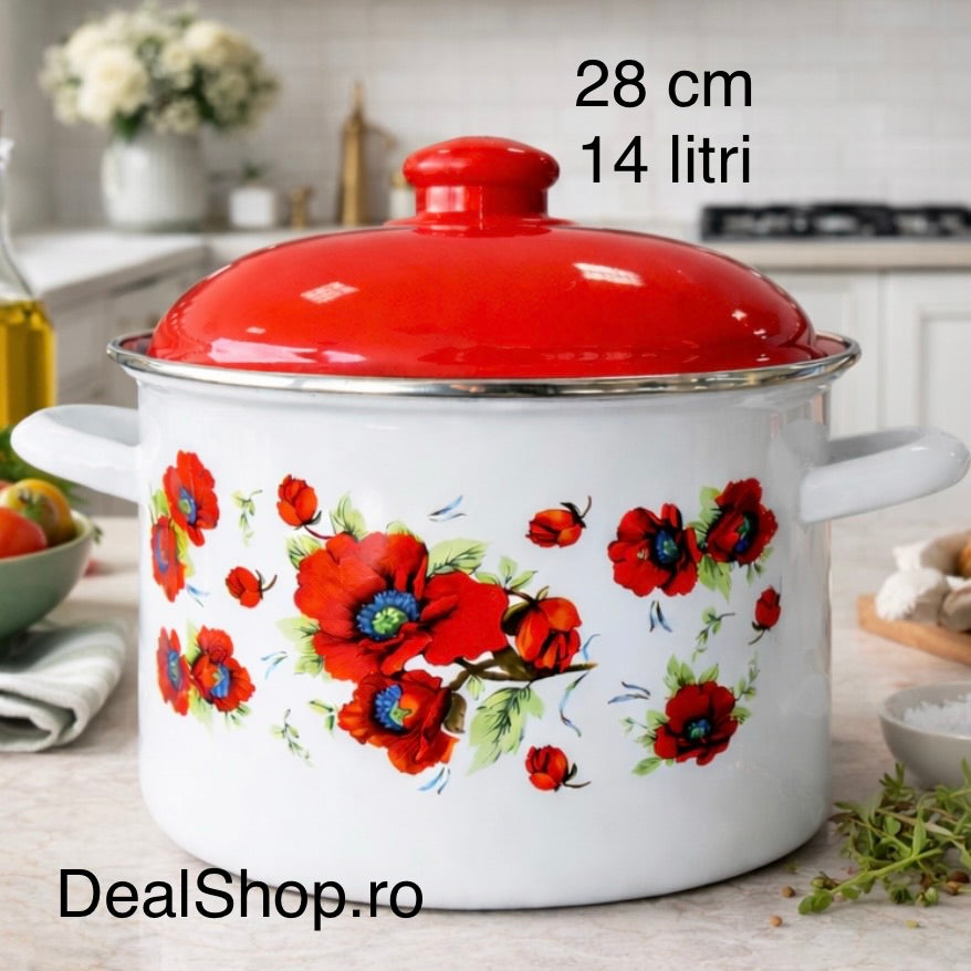 Oală Emailată Foarte Mare cu Capac 28 cm, 14L, Model Maci Roșii – Oală Emailată pentru Sarmale, Ciorbe și Gătit în Cantități Mari