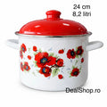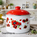 Oală Emailată Mare cu Capac 24 cm, 8.2L, Model Maci Roșii – Oală Emailată pentru Sarmale, Ciorbe și Gătit în Cantități Mari