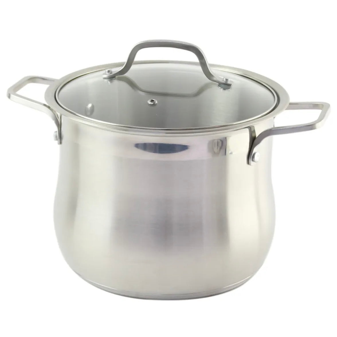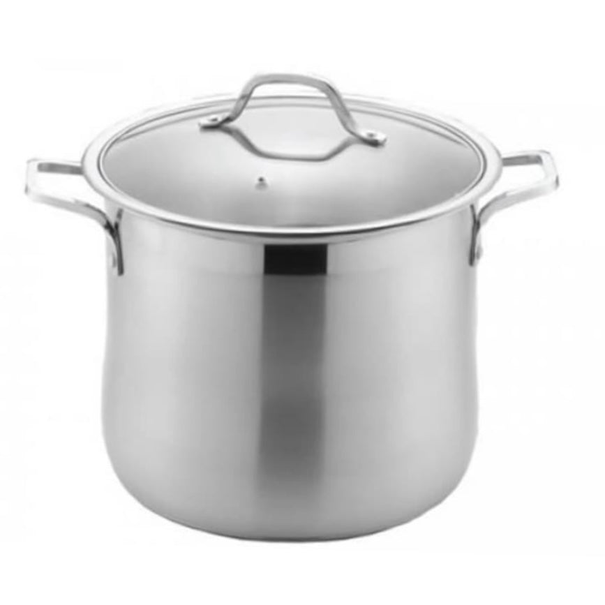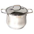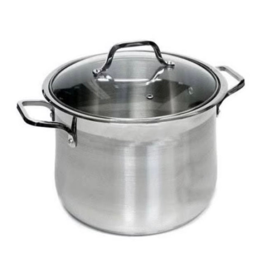 Oala inox, fund triplu, capac din sticla, forma bombata, Swan-Belly, cantitate oala 18 litri, este prevazuta cu manere solide cu aderenta care nu iau foc si are un fund triplu stratificat foarte gros de tip sandvis.