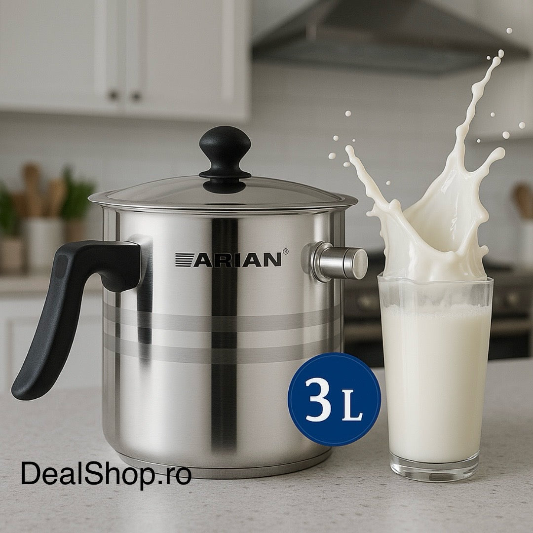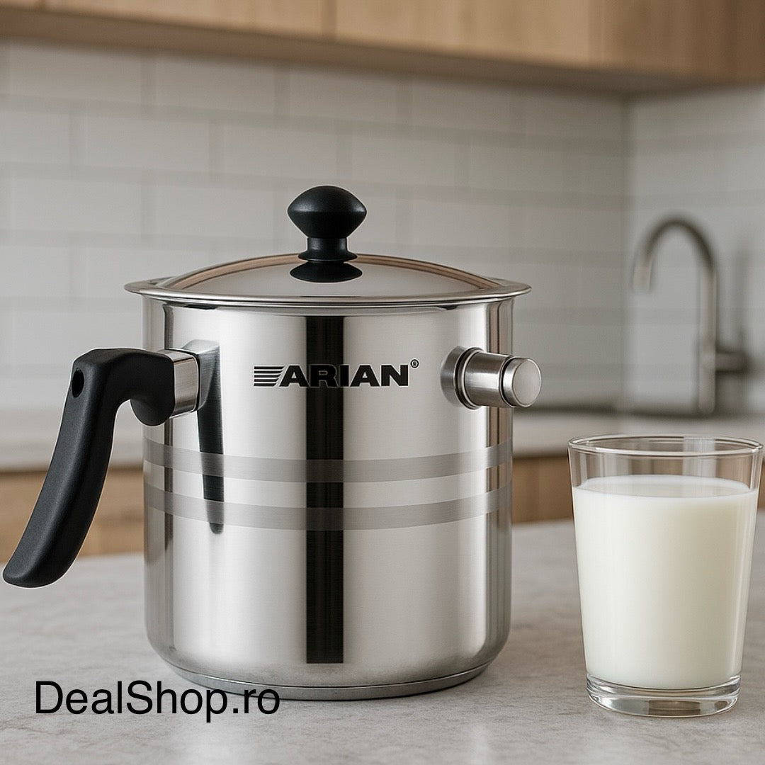 Oala pentru fiert lapte Arian, cu o capacitate de 3 litri, este alegerea perfectă pentru orice bucătărie modernă. Realizată din inox de calitate, rezistent și ușor de întreținut, această oală este concepută special pentru a preveni arderea și vărsarea laptelui.