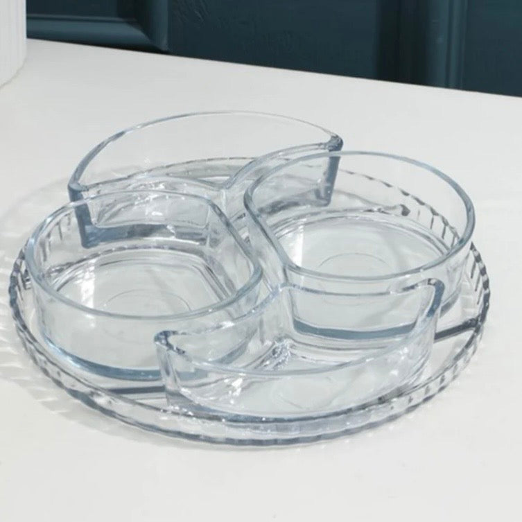 Platou Aperitiv din Sticlă Kaveh Lavin 24 cm – Set 5 Piese cu 4 Compartimente pentru Snackuri, Sosuri și Aperitive
