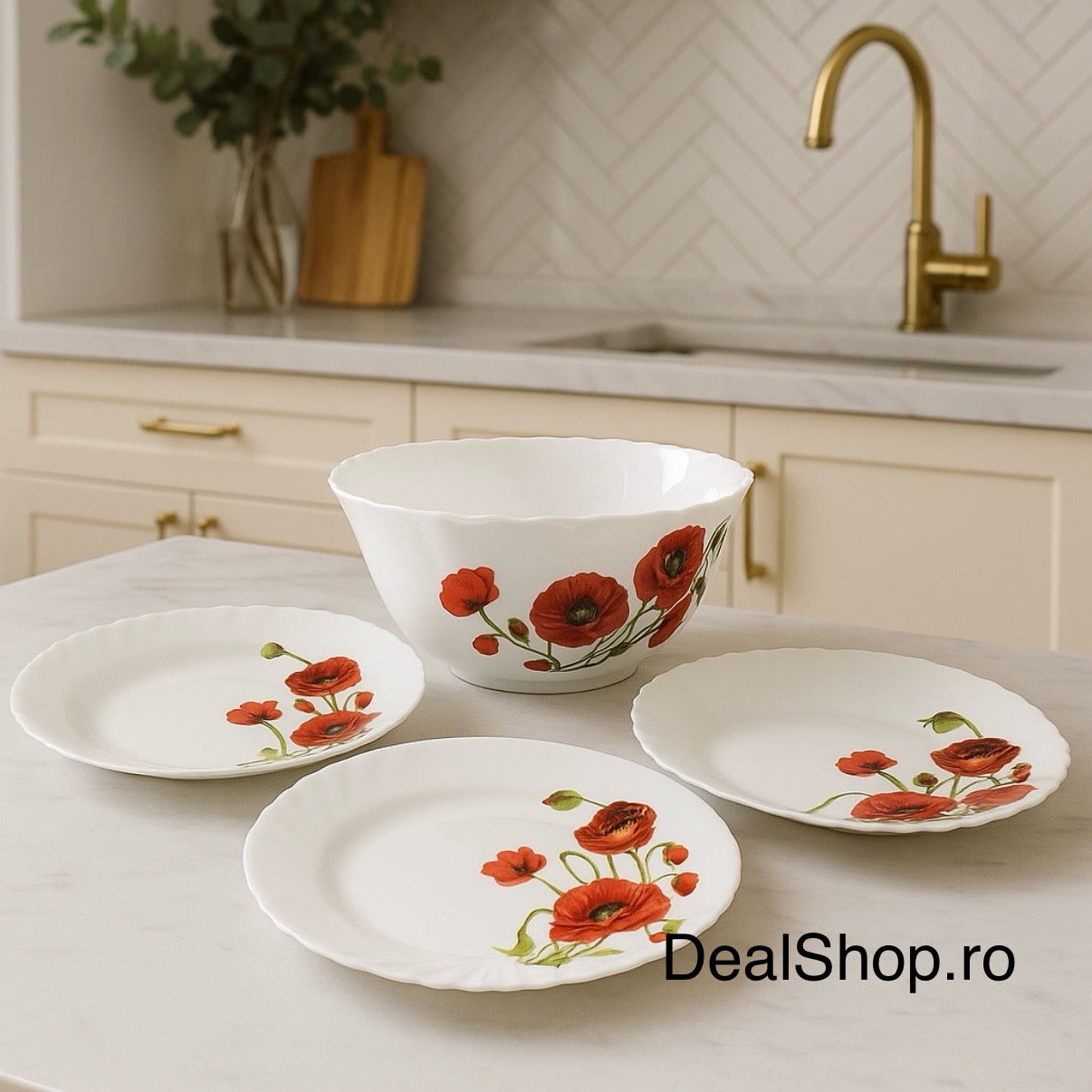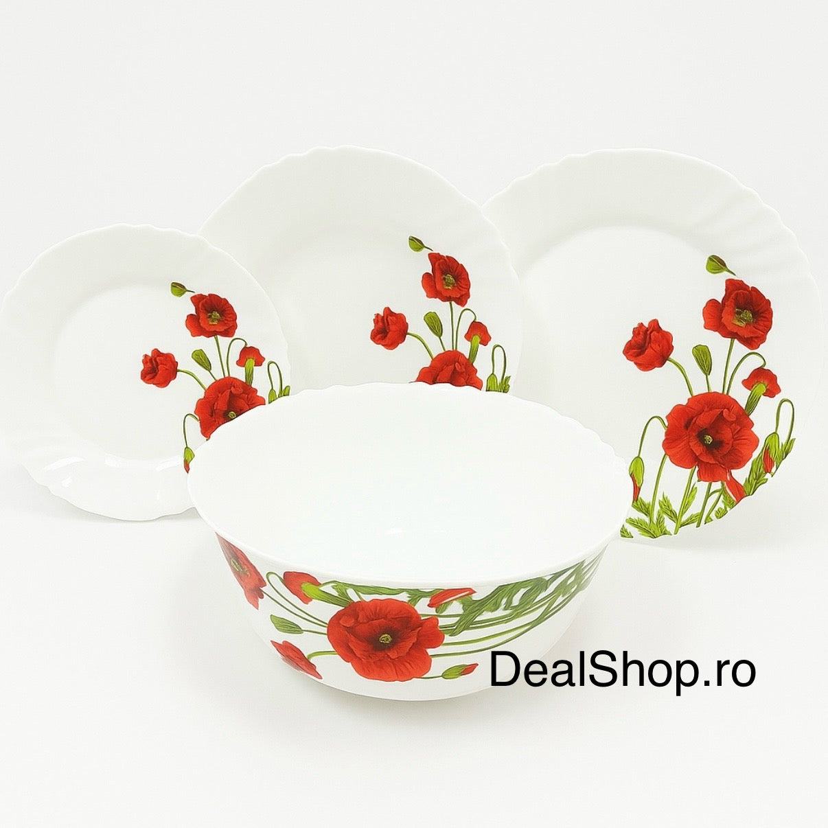 Adaugă eleganță meselor tale cu acest serviciu de masă din opal termorezistent, format din 19 piese. Setul conține 6 farfurii întinse de 25 cm, 6 farfurii adânci de 22,9 cm, 6 farfurii de desert de 19 cm și un bol de salată de 22,8 cm. Designul delicat cu flori roșii transformă fiecare masă într-o ocazie specială. Piesele sunt rezistente la temperaturi ridicate, se pot folosi în cuptorul cu microunde și se curăță ușor în mașina de spălat vase. Ideal pentru servirea a 6 persoane, potrivit atât pentru mesele de zi cu zi, cât și pentru ocazii festive.