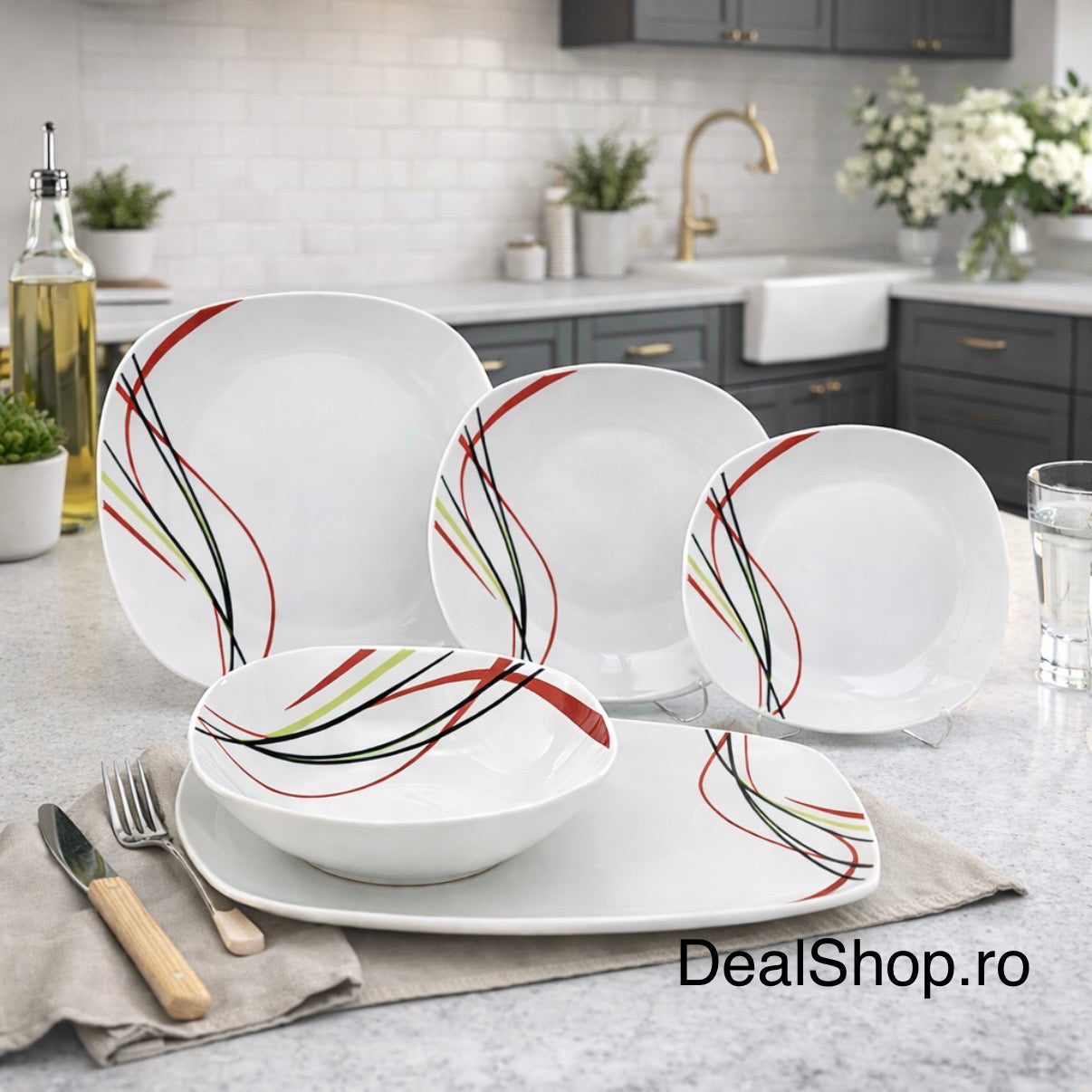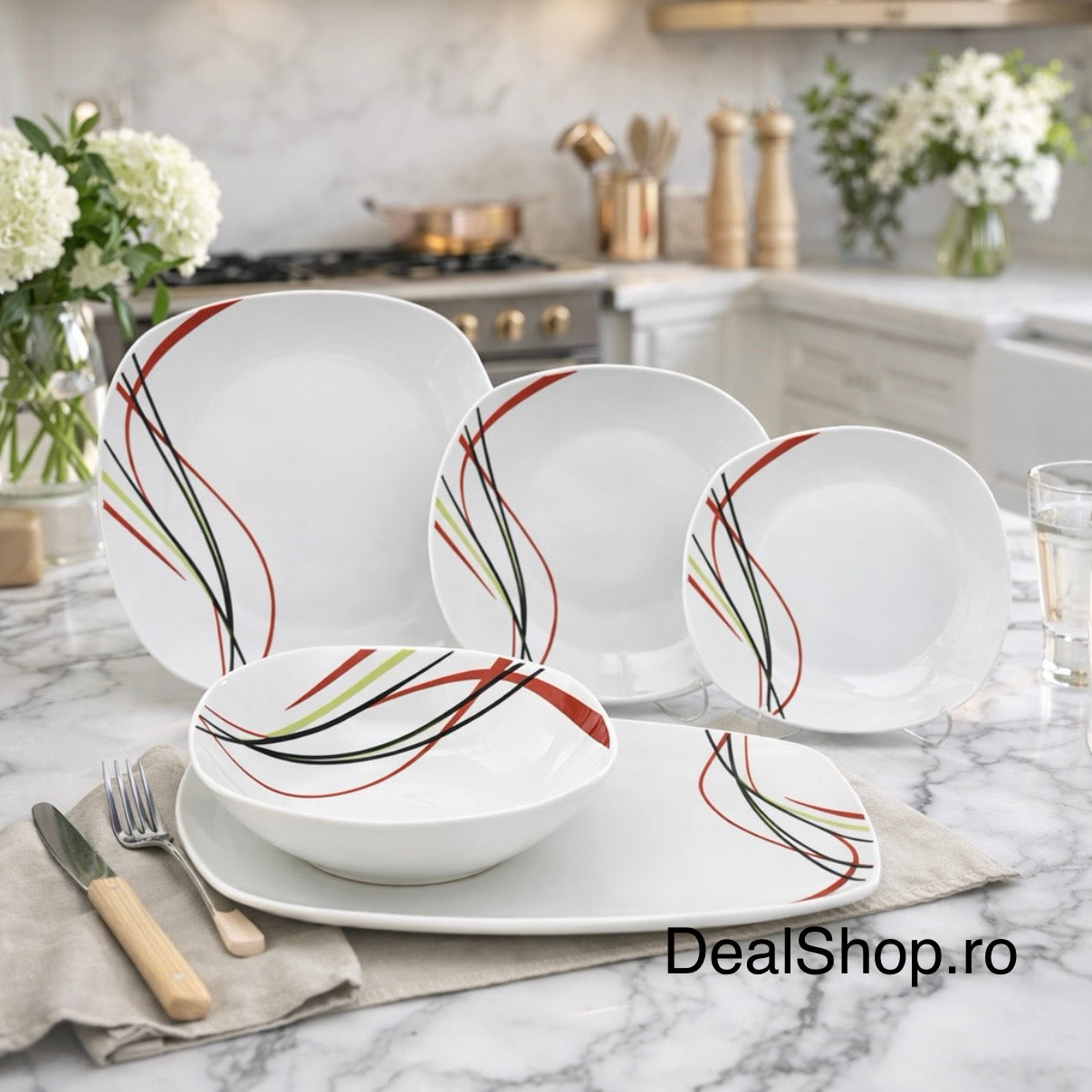 Setul este conceput pentru 6 persoane și oferă o organizare completă a mesei, incluzând farfurii pentru fel principal, supă și desert, alături de un bol generos pentru salată și un platou de servire. Finisajul alb, elegant și ușor de asortat, se integrează perfect în orice bucătărie sau dining modern.