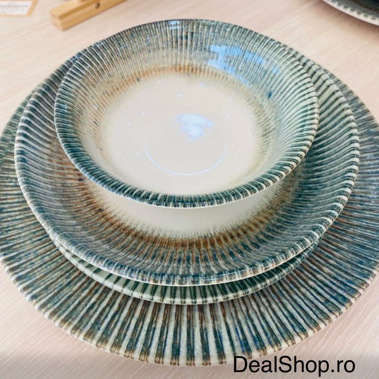 Serviciu de masă din porțelan texturat Verde-Maro, 48 piese, pentru 12 persoane – design modern și elegant 0186