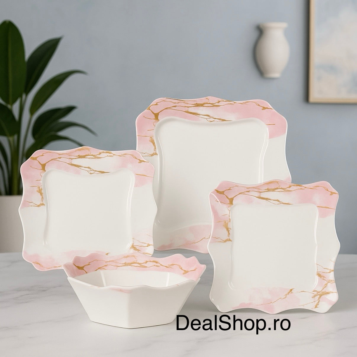 Serviciu de masa Lacy Pink 19 Piese opal Termorezistent Farfurii Pătrate pentru 6 Persoane