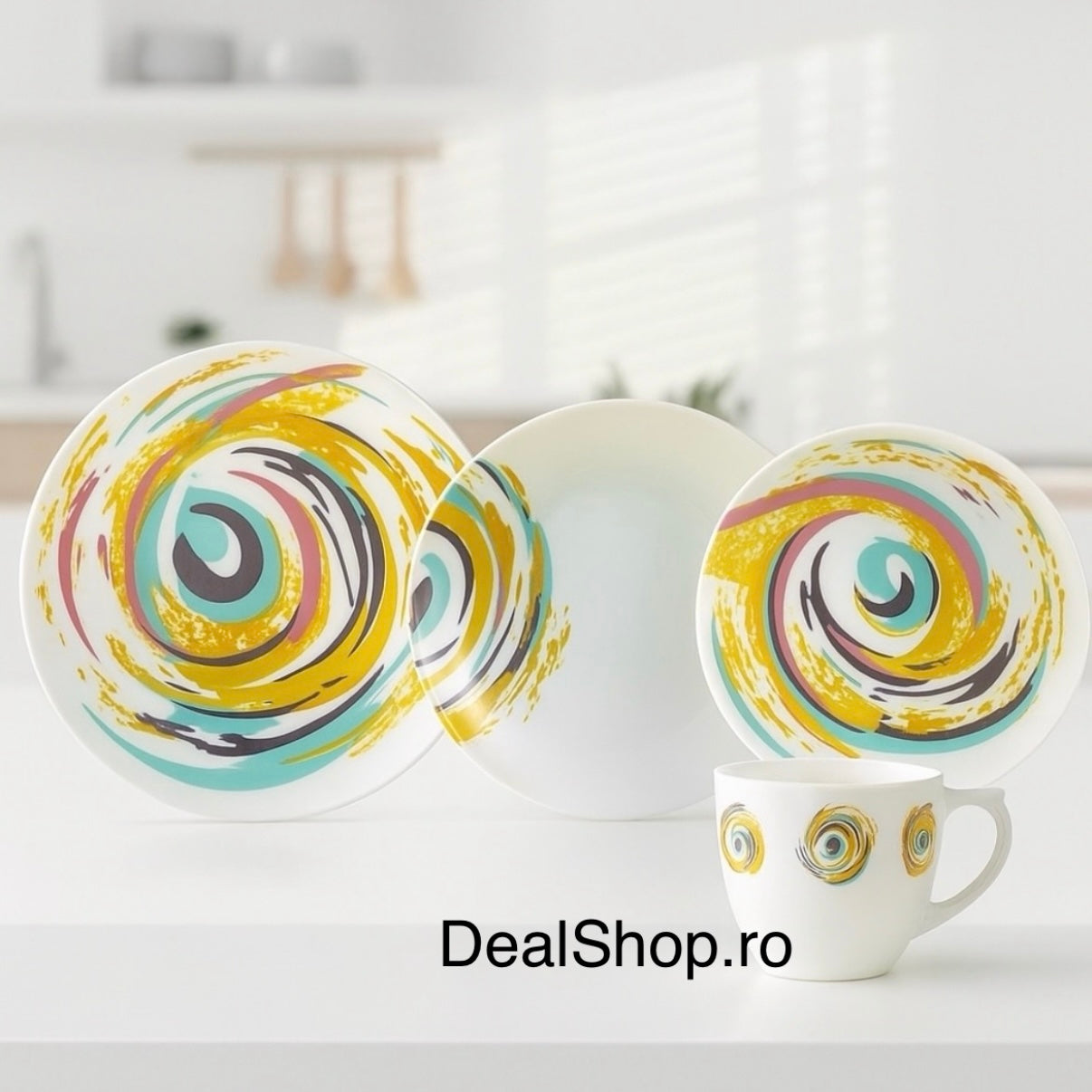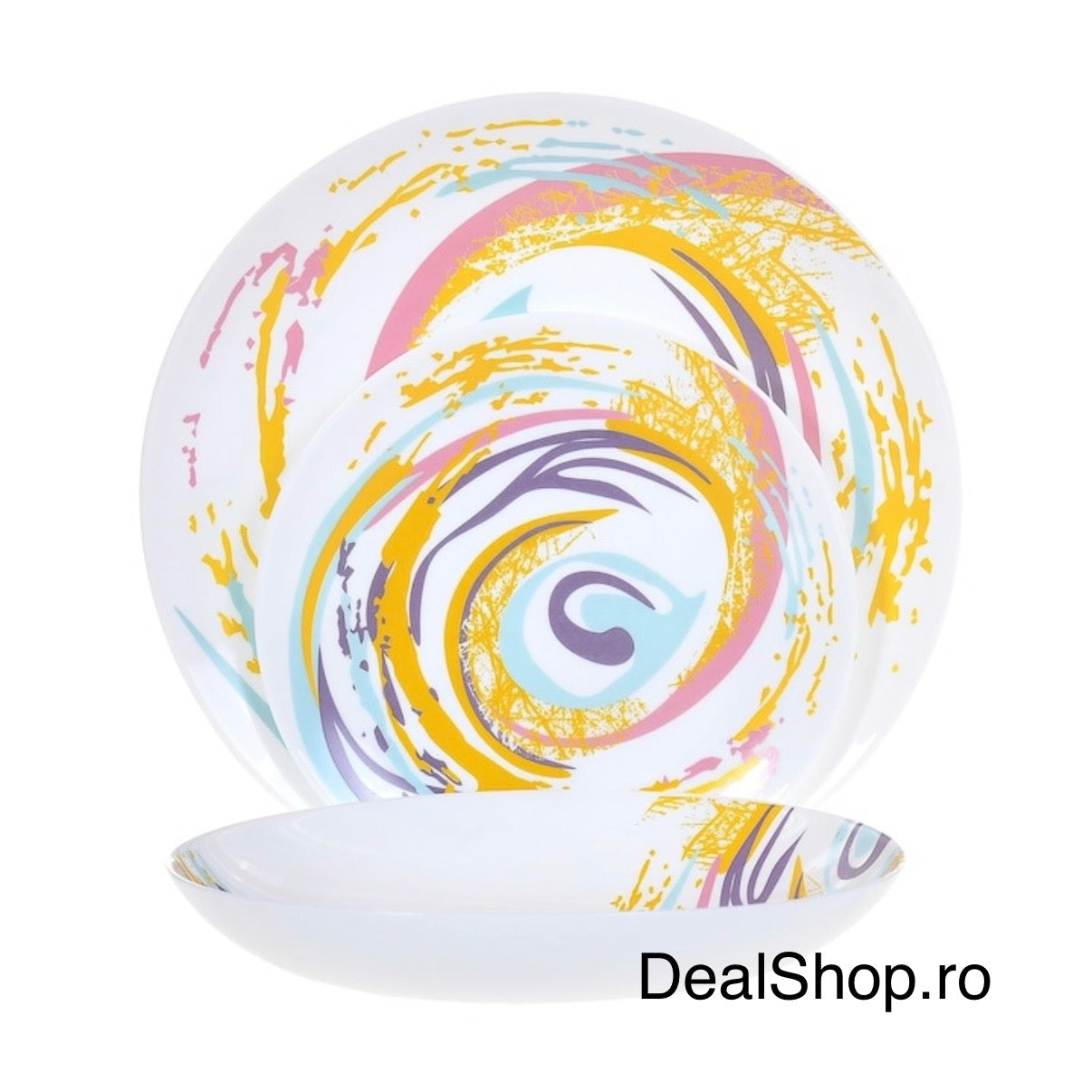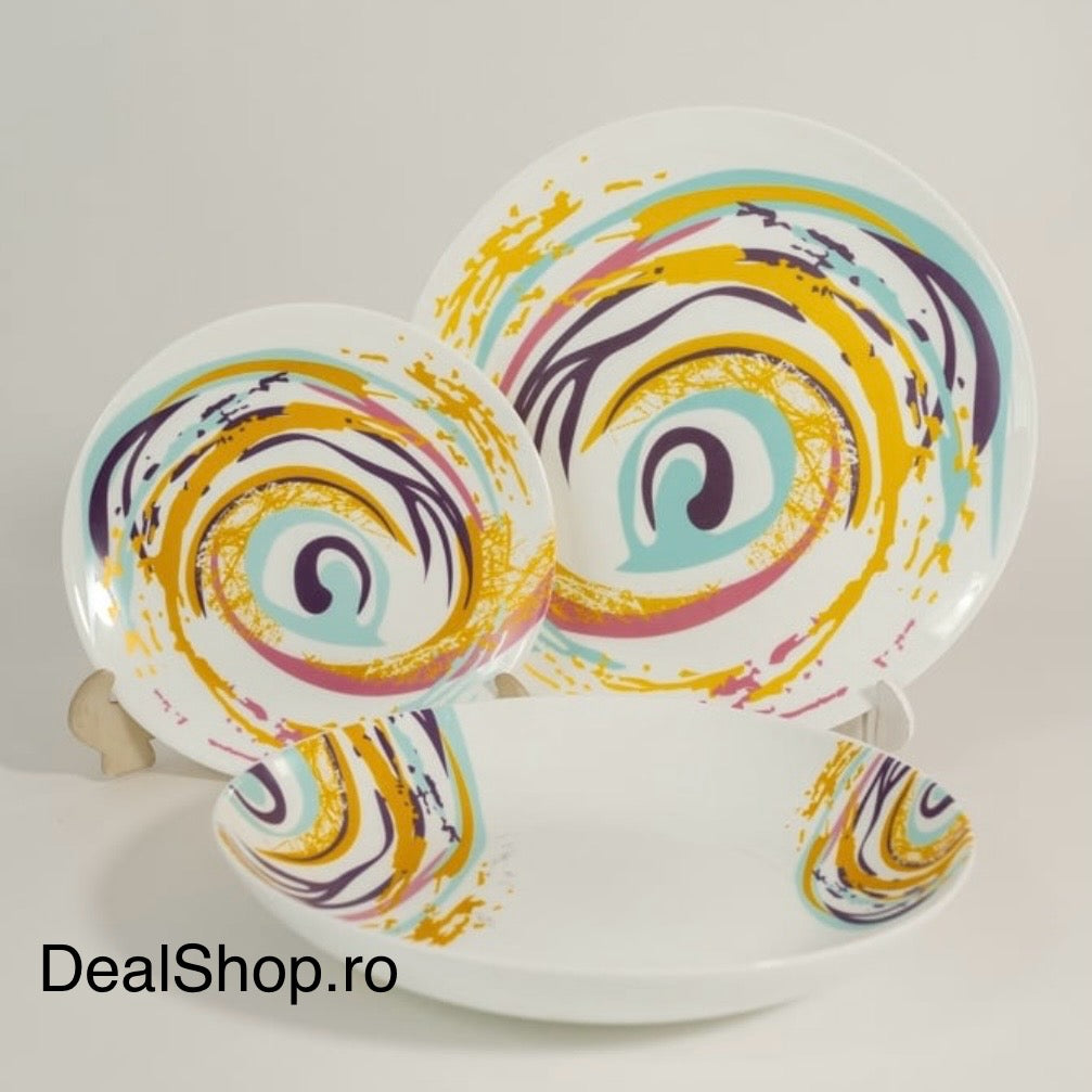 Realizat din opal de înaltă calitate, acest set este rezistent, practic și ușor de integrat atât în mesele zilnice, cât și la ocazii speciale. Designul modern, cu imprimeu Spiral colorat, transformă fiecare masă într-o experiență plină de stil.