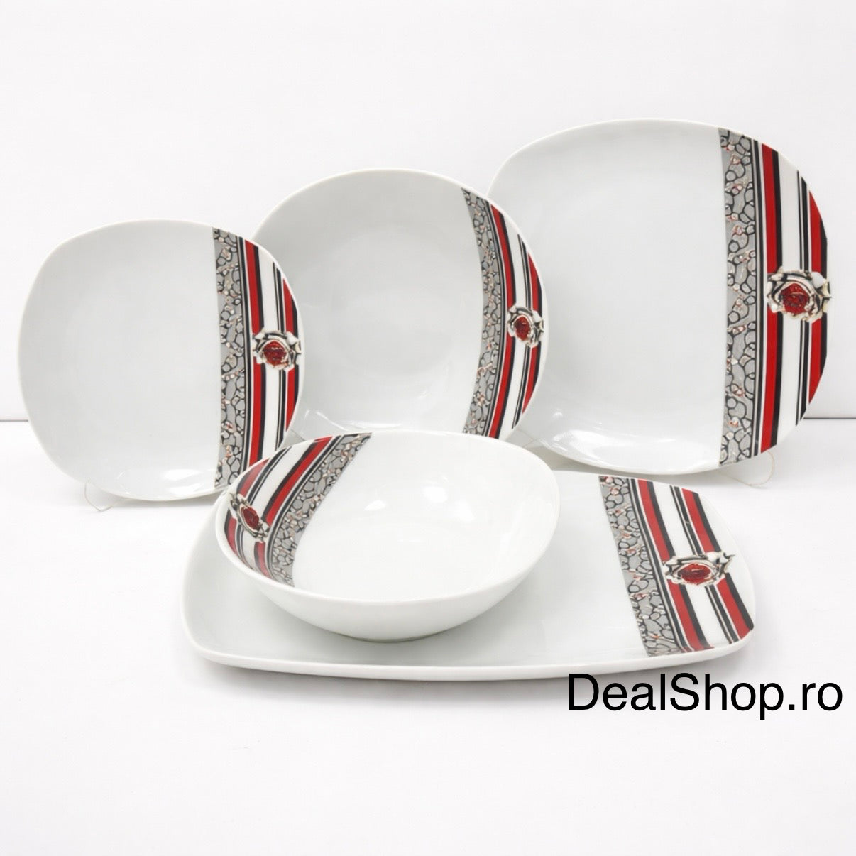 Realizat din porțelan de calitate, acest set combină designul modern al farfuriilor pătrate cu un decor rafinat în nuanțe de roșu și negru.
