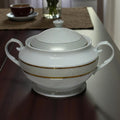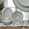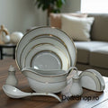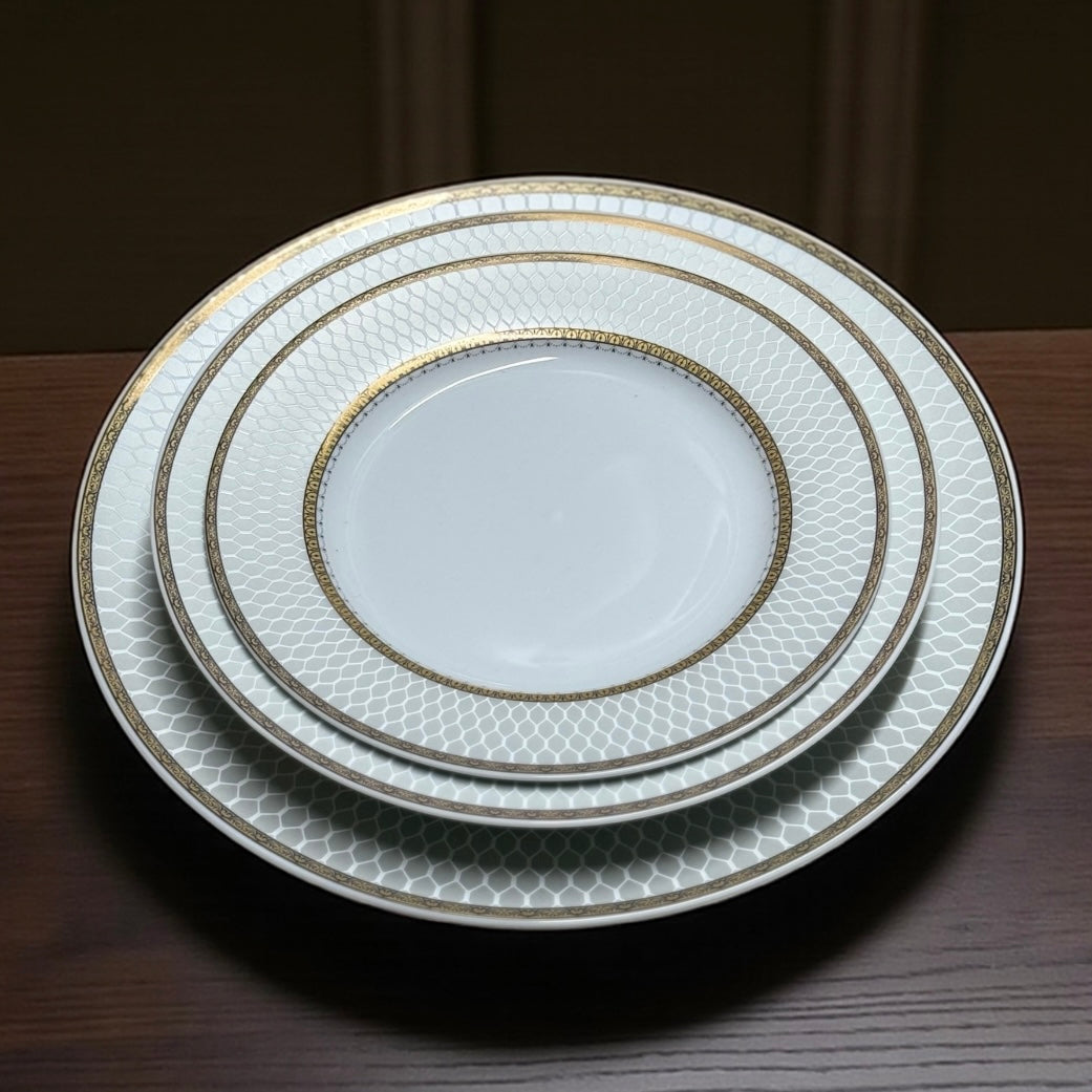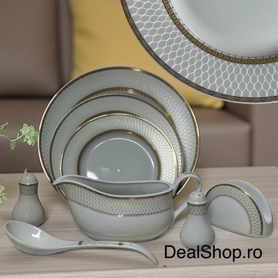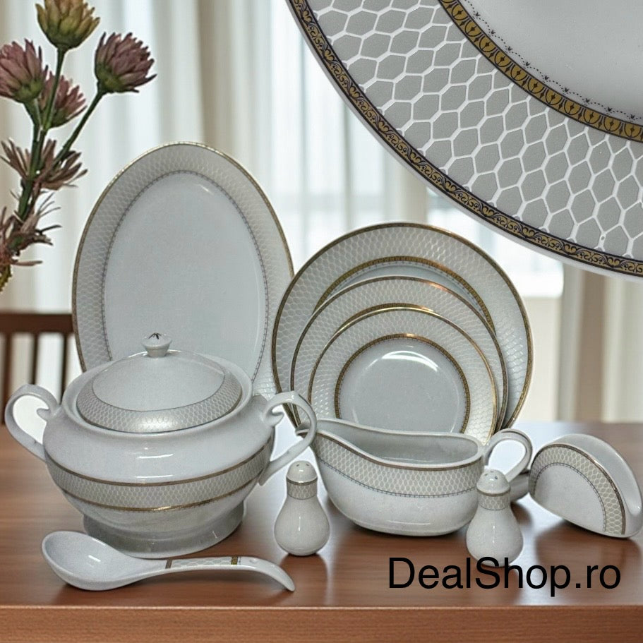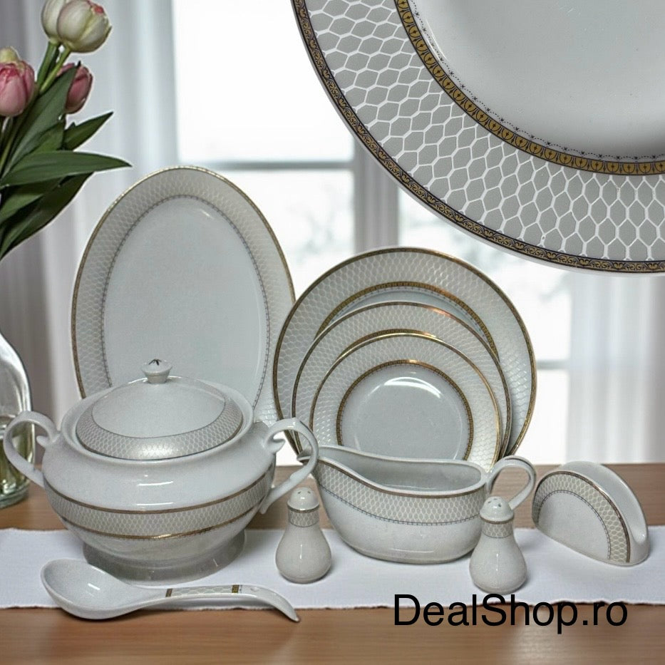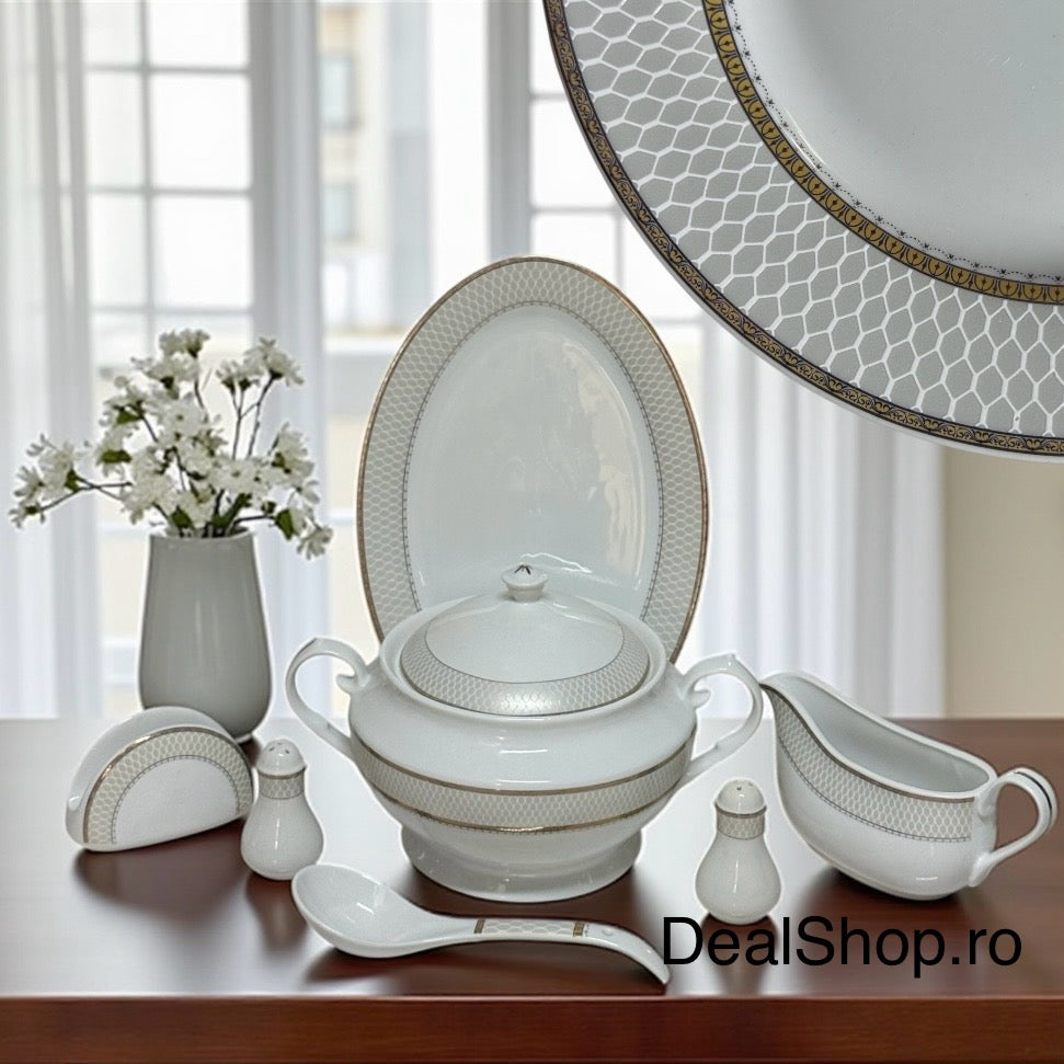 Cu design alb și accente aurii fine, setul conține farfurii, platouri, supieră, sosieră și accesorii esențiale pentru o servire impecabilă