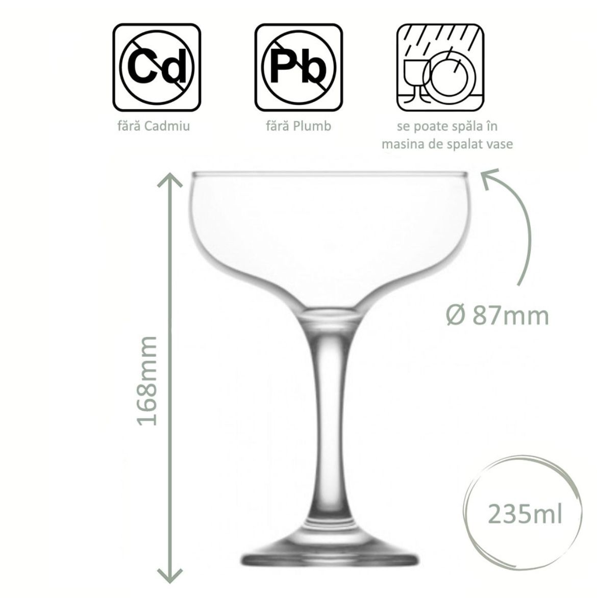 - Set de 12 Pahare Fiecare pahar are o capacitate de 235 ml, perfect pentru servirea unei game variate de băuturi fine de la cocktailuri și vin spumant până la deserturi lichide.