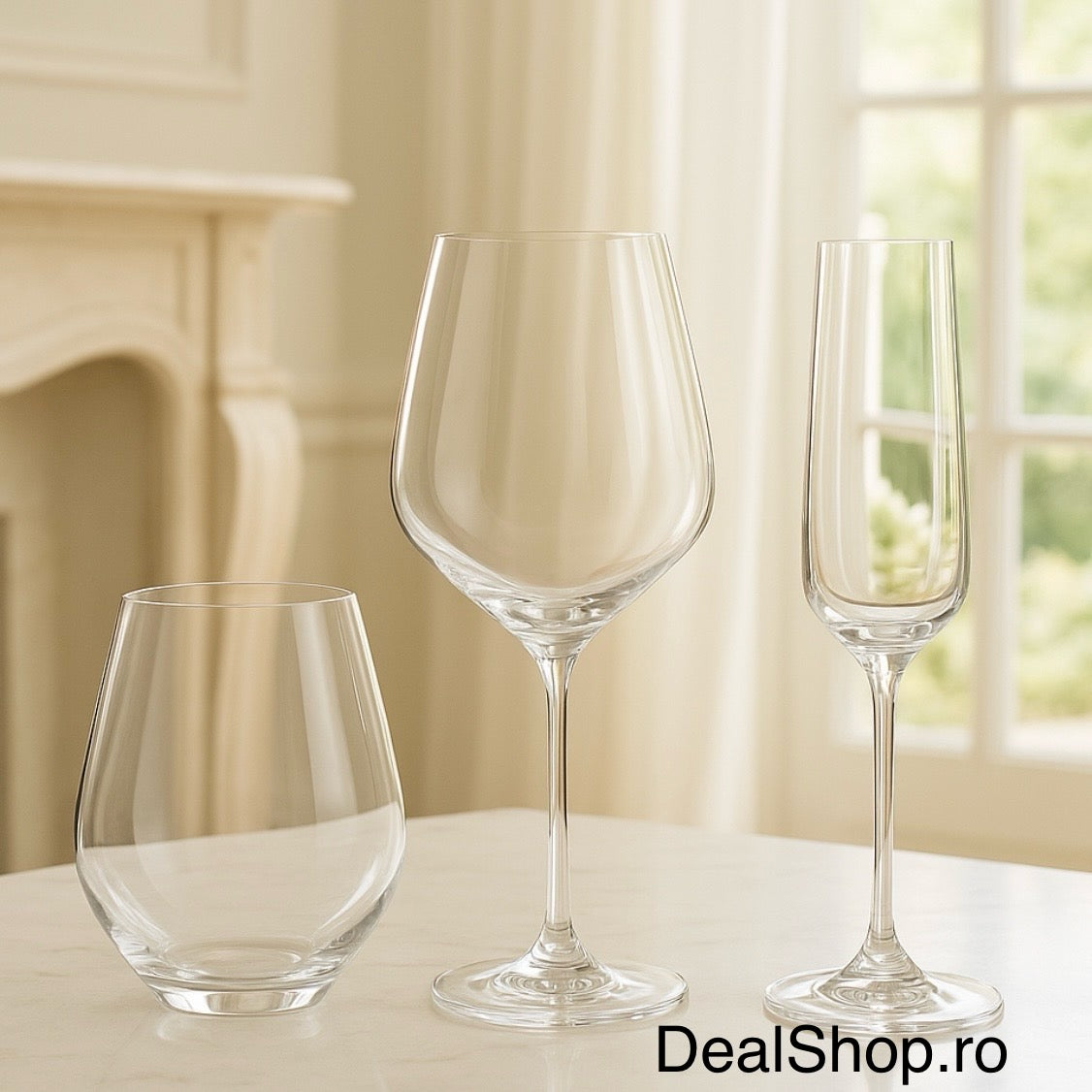 Adaugă rafinament oricărui eveniment cu Setul de 18 pahare din cristal fără plumb creat pentru a evidenția aromă și gustul fiecărei băuturi