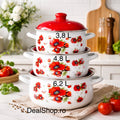 Set 3 Oale Emailate Bucătărie cu Capac – 3,8L / 4,8L / 6,2L – Model Maci Roșii