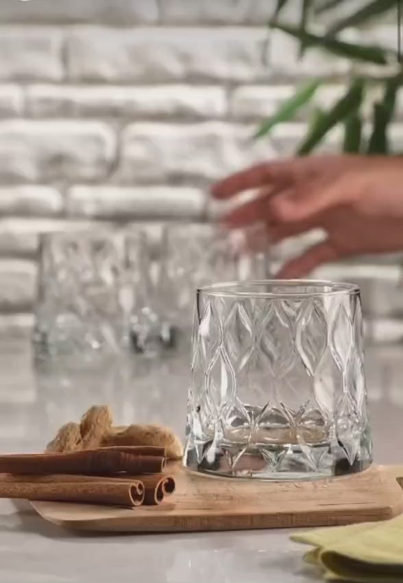 Alege rafinamentul la fiecare servire cu setul de 4 pahare Leafy, 320 ml, realizate din sticlă groasă de înaltă calitate, cu un design elegant în relief tip frunză. Aceste pahare impresionează prin aspectul modern și textura sofisticată, fiind ideale pentru whisky, cocktailuri, sucuri sau băuturi răcoritoare.