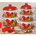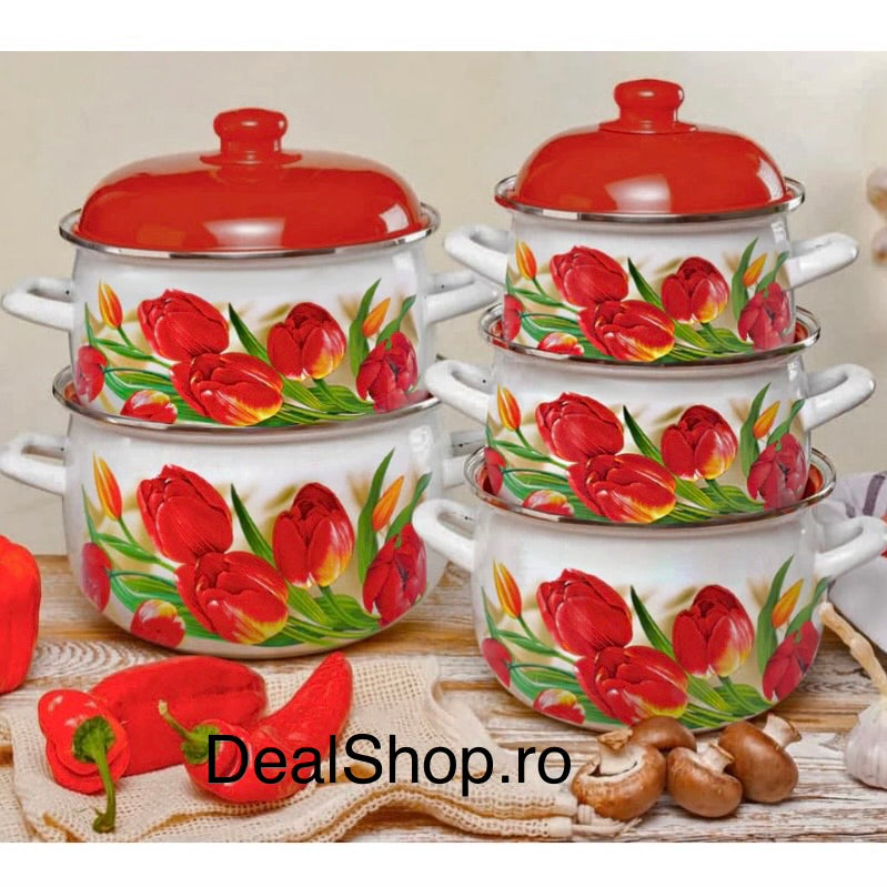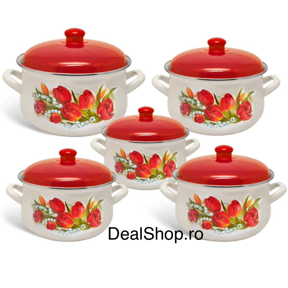 Set 5 oale emailate cu capac Arian, cantitate 2 l, 2,8 l, 3,8 l, 4,8 l, 6,2 l, model lalele
