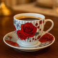 Savurează cafeaua sau ceaiul preferat într-un set elegant și rafinat, compus din 6 cești și 6 farfurii asortate, cu o capacitate de 120 ml. Designul deosebit, decorat cu trandafiri roșii și albi pe fundal cu dungi fine, aduce un plus de stil și romantism oricărei mese.