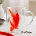 Set 6 Cești din Sticla Dublu-Perete cu Model Pene Roșii – 350 ml
