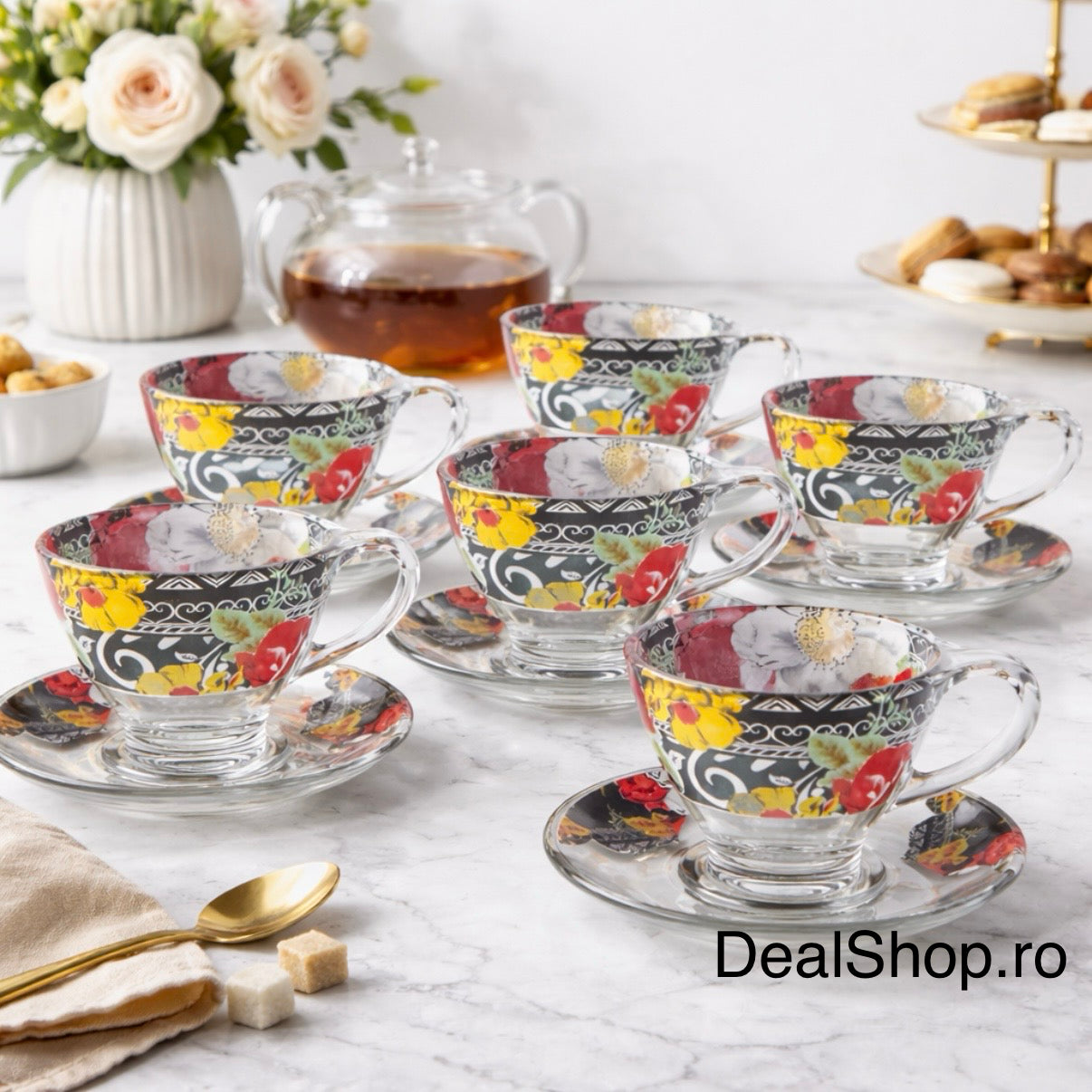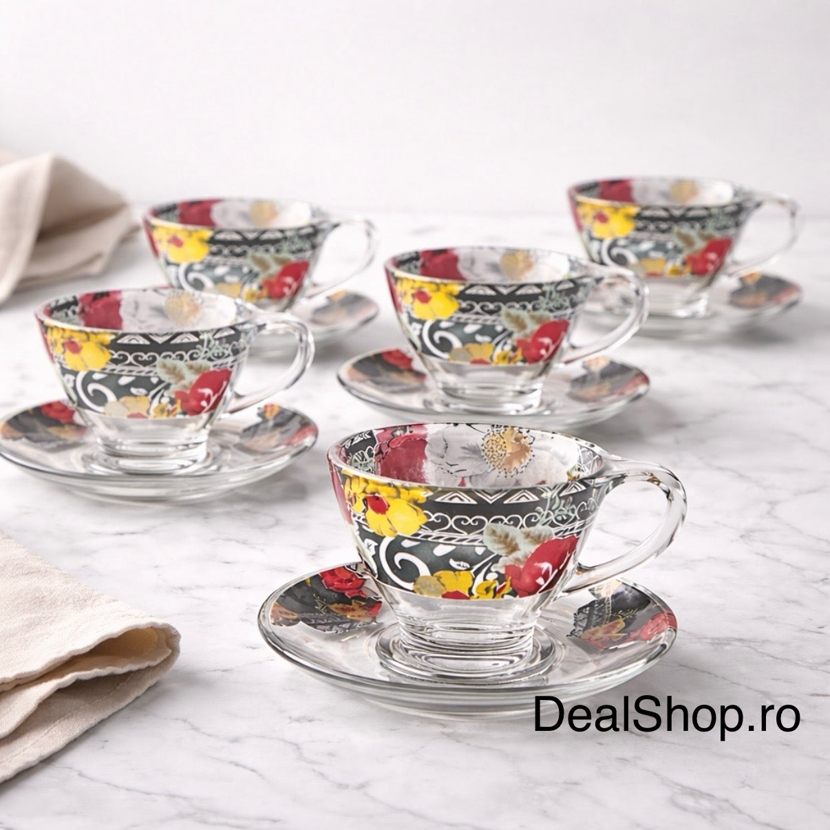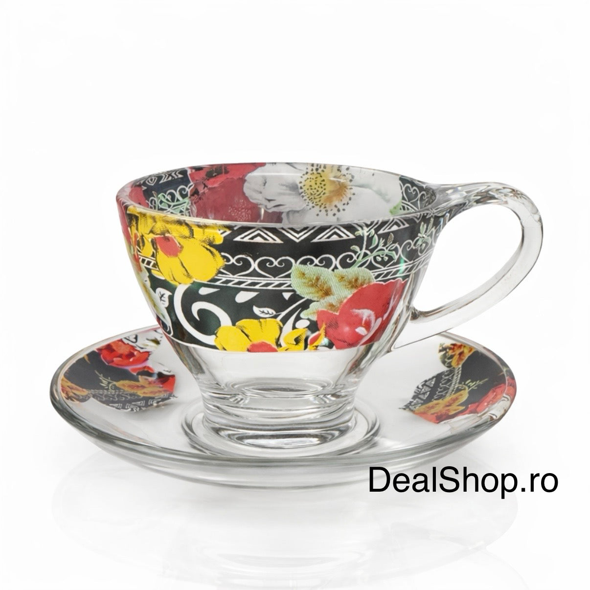Ceștile sunt realizate din sticlă transparentă de calitate, cu decor floral aplicat atent, iar farfurioarele completează armonios aspectul setului. Forma ergonomică și mânerul confortabil asigură o utilizare practică și sigură.