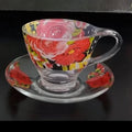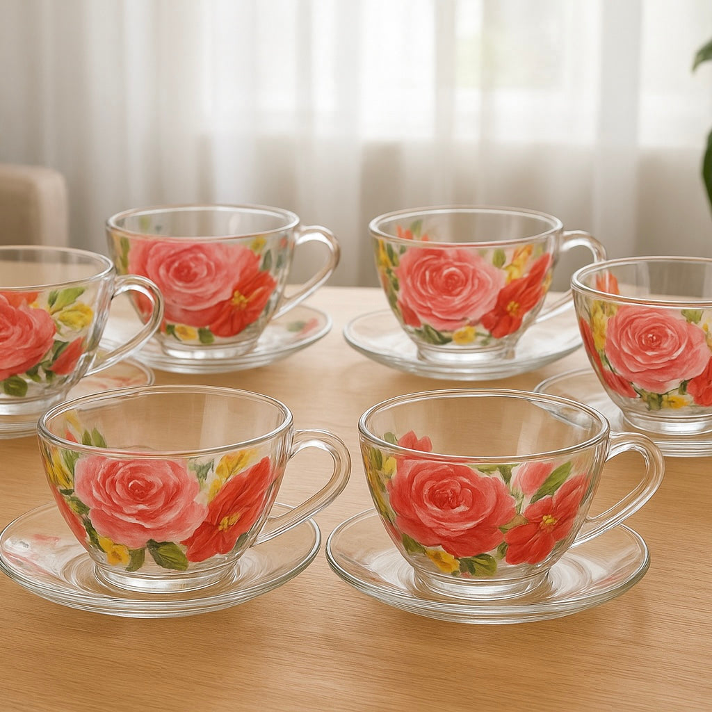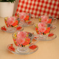 Set 6 cești sticla 200 ml cu 6 farfurioare decor floral TRANDAFIR Galaxy