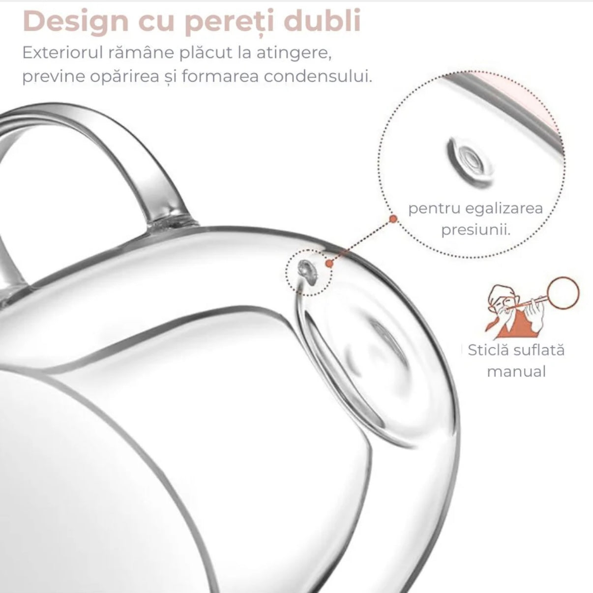Acestea sunt realizate din sticlă termorezistentă de înaltă calitate și au un design inovator, cu pereți dubli, care oferă izolare termică, menținând băutura caldă mai mult timp și protejând-vă mâinile de căldură excesivă.