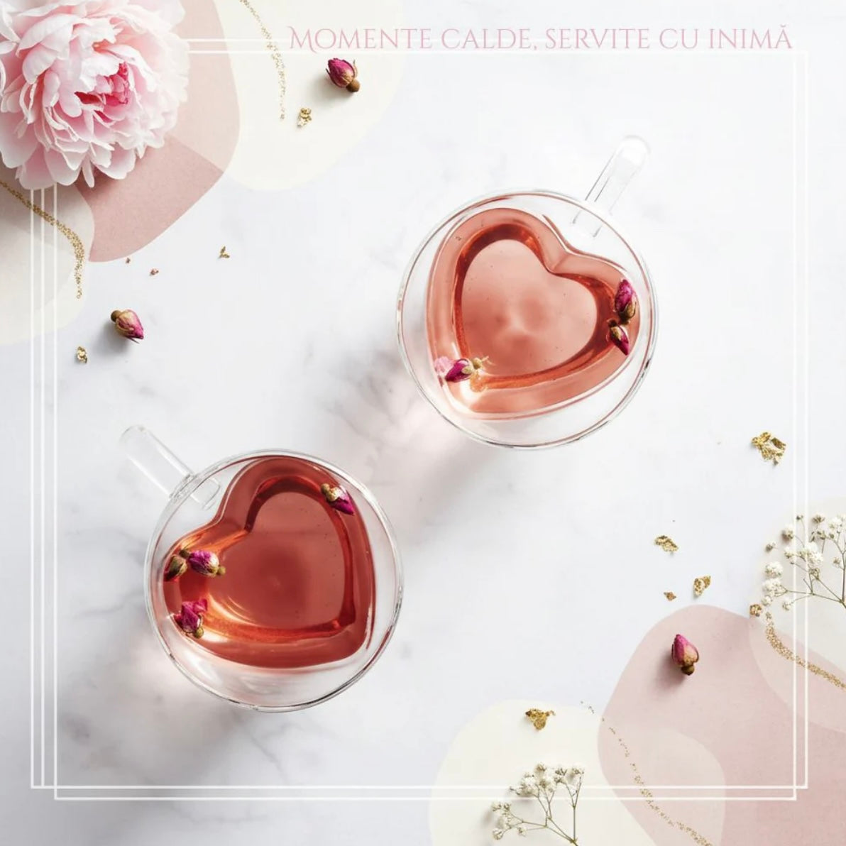 Adaugă un strop de eleganță și căldură fiecărei zile cu setul de 6 cești cafea pereti dublii sticlă termorezistentă, model inimă, 180 ml , o alegere perfectă pentru moment de răsfăț!