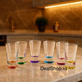 Adaugă un strop de veselie și stil fiecărei petreceri cu setul nostru de 6 pahare colorate din sticlă pentru shoturi, fiecare cu o capacitate de 35 ml