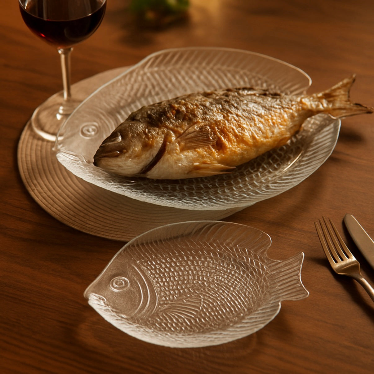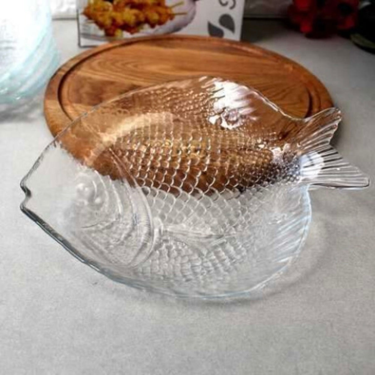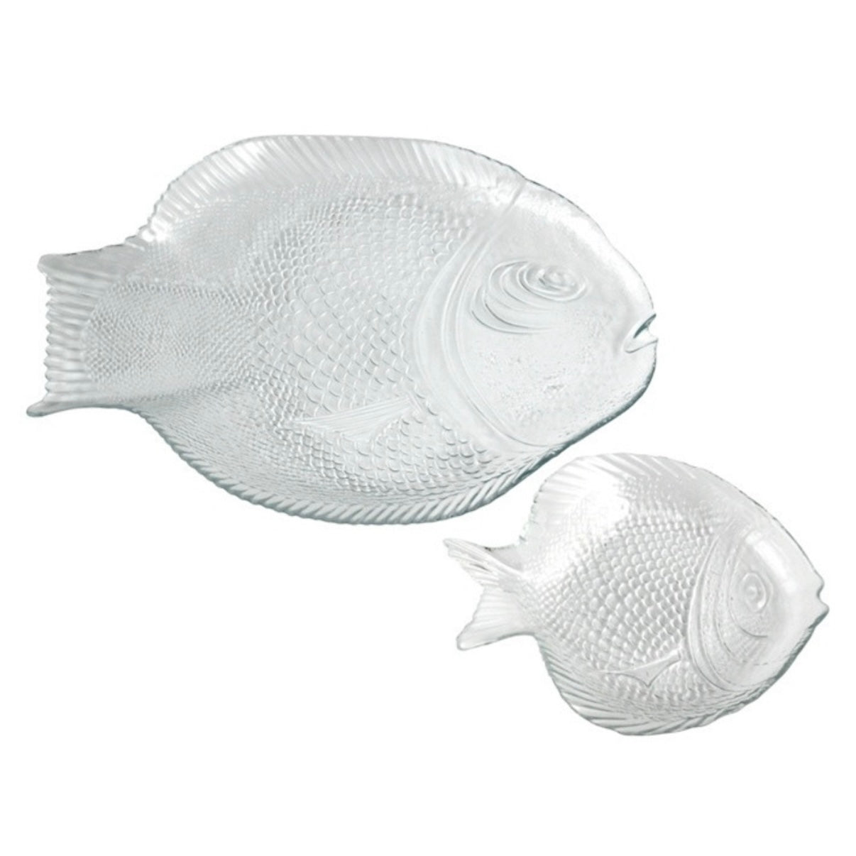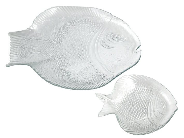 Setul de platou si 6 farfurii din sticla, in forma de peste reprezinta o alegere inspirata pentru cei care isi doresc sa adauge un strop de originalitate si creativitate in amenajarea spatiului de servire a mesei. Este ideal pentru servirea aperitivelor sau a gustarilor cu peste, fructe de mare si nu numai transformand fiecare masa intr-o experienta unica.