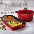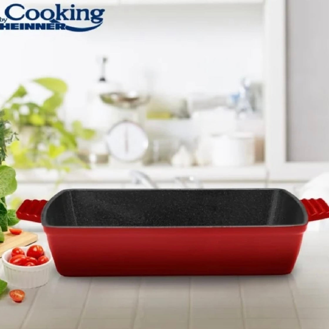Set tavă cuptor + cratiță fontă emailată Cooking by Heinner Red Line – Tavă 33x23x7 cm + Cratiță 6L cu capac, gătire uniformă