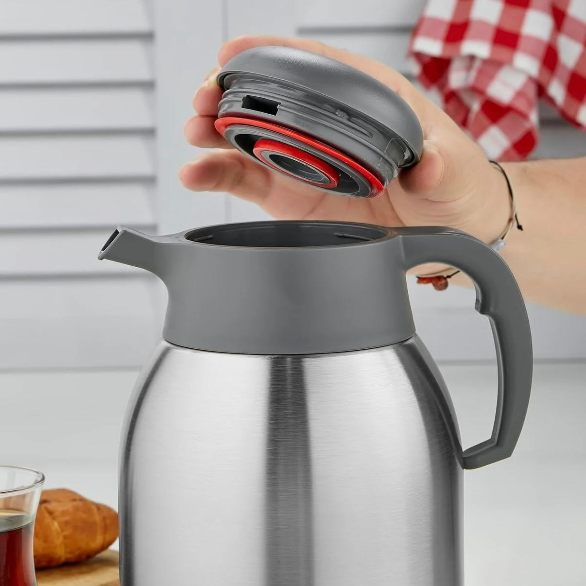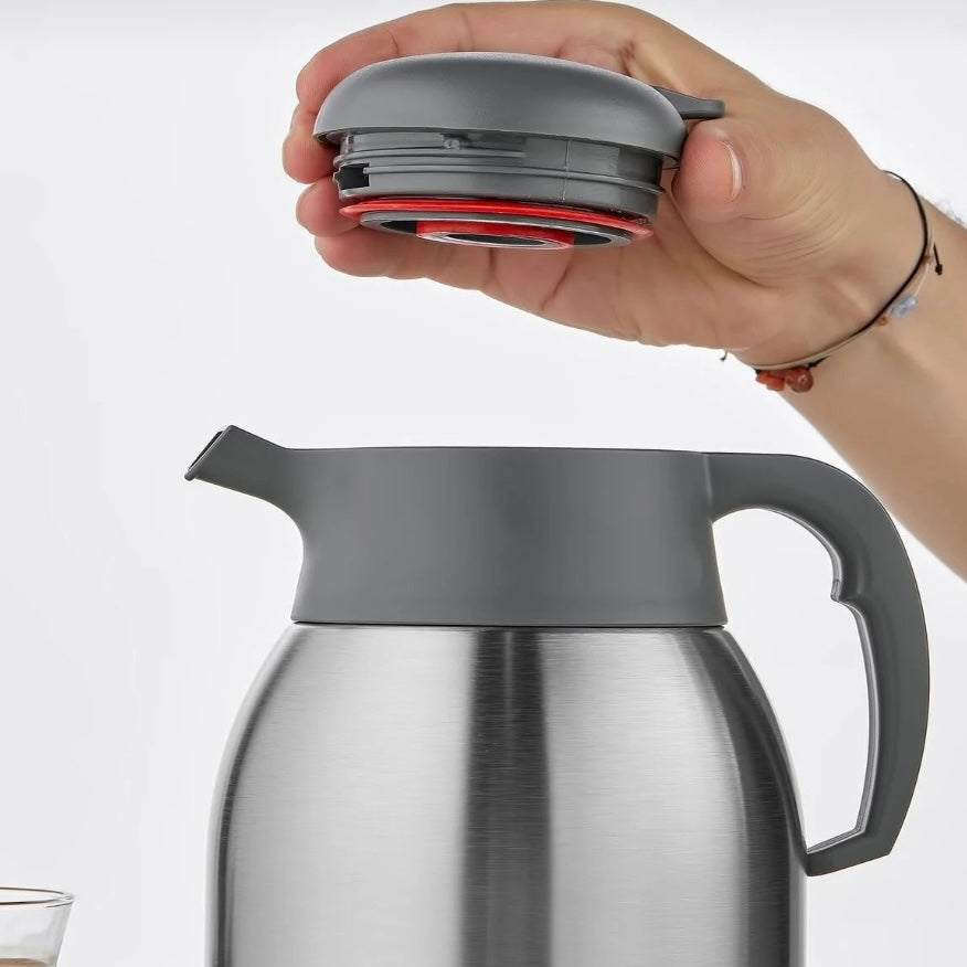 Capacul etanș, cu sistem anti-stropire, asigură o turnare precisă și sigură, fiind ideal pentru servirea ceaiului, cafelei sau a altor băuturi calde ori reci. Designul ergonomic cu mâner solid oferă confort sporit în utilizare, iar capacul poate fi folosit ca pahar/cană, pentru un plus de funcționalitate.
